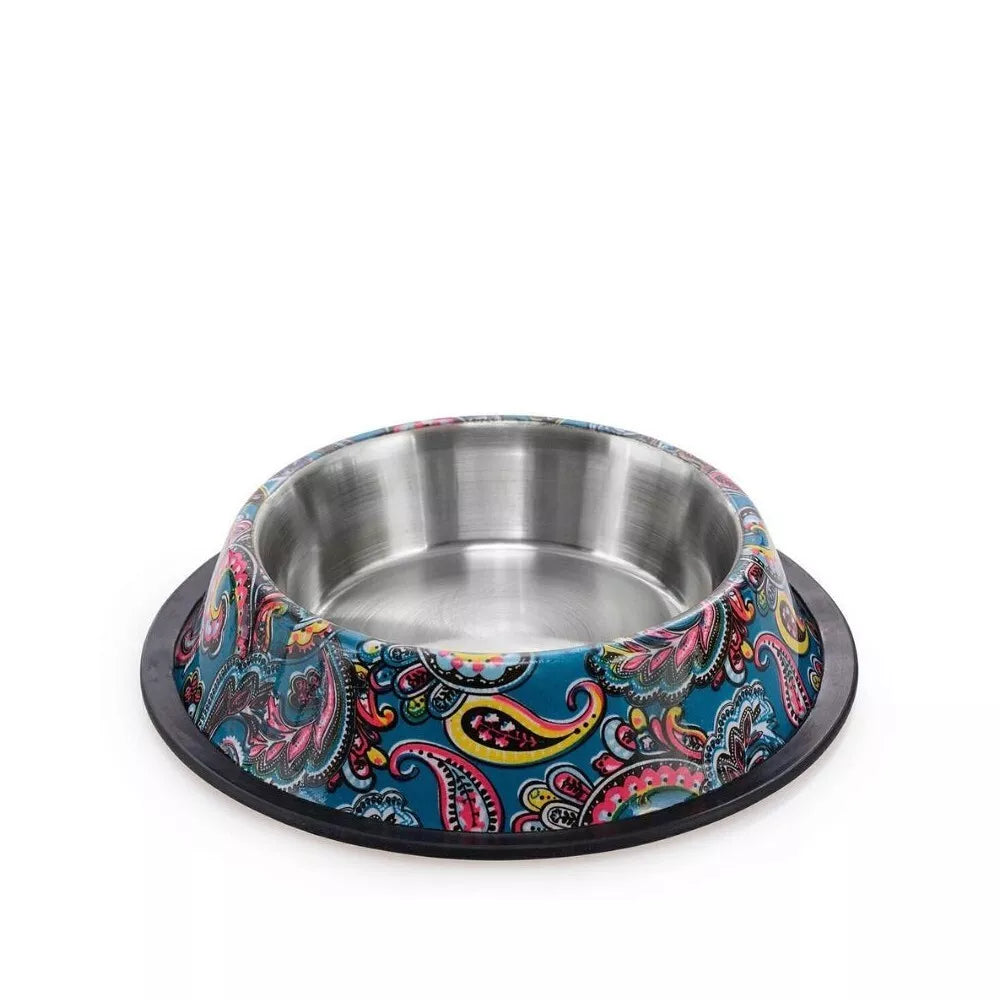 Iš nerūdijančio plieno pagamintas dubuo, padengtas spalvingu raštu. Dėl specialios formos dubenį sunku apversti, be to, jis turi guminį apvadą, kuris neleidžia dubeniui slysti. Tinka tiek vandeniui, tiek maistui. Prekių nuotraukos yra iliustracinio pobūdžio. Prekės aprašymas yra bendro pobūdžio ir ne visos savybės gali būti paminėtos. Ant produkto pakuotės nurodoma informacija yra detalesnė. Rekomenduojame vadovautis informacija esančia ant prekės pakuotės.