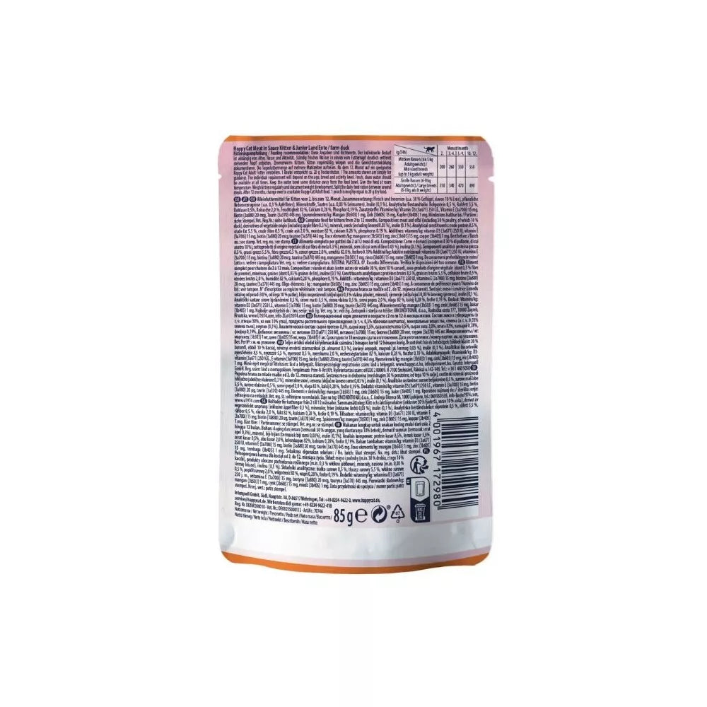 „Happy Cat Meat in Sauce Kitten & Junior“ sudėtyje - aukštos kokybės mėsa. Lengvai virškinamas guliašas su antiena ir skaniu padažu yra specialiai pritaikytas mažų kačiukų poreikiams. Skaniame pilnaverčiame maiste yra viskas, ko reikia harmoningam kačiuko augimui.