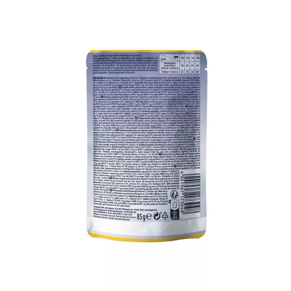 „Happy Cat Meat in Sauce“ guliašas su paukštiena stiprina organizmo imuninę apsaugą bei tinka sterilizuotoms katėms. Visavertis pašaras suaugusioms katėms nuo 12 mėnesių. Begrūdė formulė. Tinka ir sterilizuotoms katėms. Sudėtis: mėsa ir jos perdirbimo produktai iš paukštienos 40%,augaliniai produktai (obuolių skaidulos 0,3%), mineralai, sėklos (linų sėmenys 0,03%), inulinas 0,1%. Analitinės sudedamosios dalys: žali baltymai 8,0%, žali riebalai 4,5%, žalia ląsteliena 0,3%, žali pelenai 2,0%, drėgnis 82%. Priedai: vitaminai/1 kg: vitaminas D3 (3a671) 250 TV, vitaminas E (3a700i) 15 mg, biotinas (3a880) 20 mcg, taurinas (3a370) 445 mg. Mikroelementai/1 kg: manganas (3b503) 1 mg, cinkas (3b605) 15 mg, varis (3b405) 1 mg. Šėrimo rekomendacijos: žr. lentelę ant pakuotės. Dienos norma yra orientacinė ir gali skirtis priklausomai nuo augintinio amžiaus, veislės ir aktyvumo. Augintinis visuomet turi turėti šviežio vandens. Guliašą duoti kambario temperatūros. 1 pakuotė guliašo atitinka ~20 g sauso maisto. Laikyti sausoje, vėsioje vietoje, atokiai nuo tiesioginių saulės spindulių. Geriausias iki/Partijos Nr./Grynasis kiekis/Gamintojas: žr. ant pakuotės. Prekių nuotraukos yra iliustracinio pobūdžio. Prekės aprašymas yra bendro pobūdžio ir ne visos savybės gali būti paminėtos. Ant produkto pakuotės nurodoma informacija yra detalesnė. Rekomenduojame vadovautis informacija esančia ant prekės pakuotės.