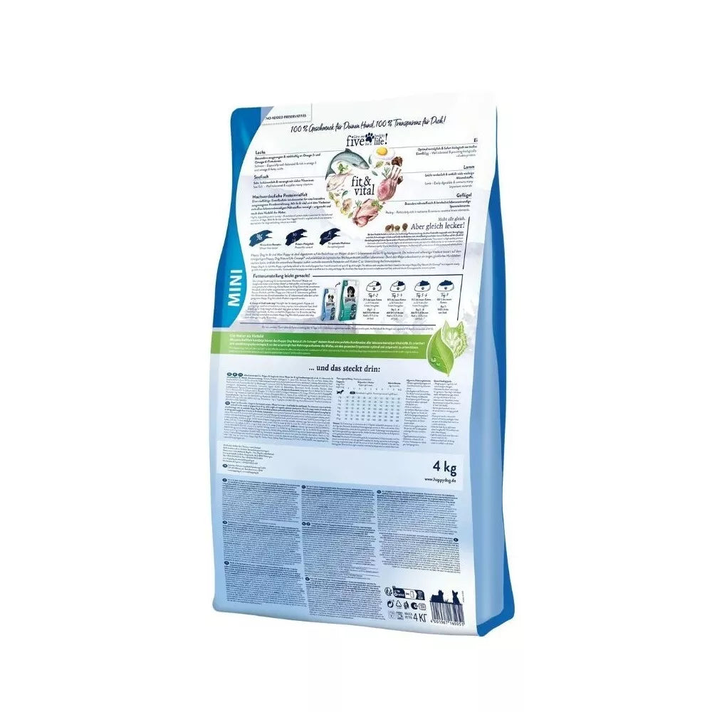 Happy Dog fit & vital Mini Puppy - specialiai subalansuotas visavertis maistas šuniukams nuo pirmojo gyvenimo mėnesio. Pašaras be kviečių. Sausame maiste yra penki, specialiai atrinkti, aukštos kokybės gyvuliniai baltymai – gerai toleruojama ėriena, lengvai virškinama paukštiena, soti jautiena, žuvis ir kiaušiniai, kurie užtikrina subalansuotą augimą ir optimalų vystymąsi. Vertingosios Naujosios Zelandijos midijos užtikrina kaulų, sausgyslių, raiščių ir sąnarių augimą ir sveiką vystymąsi. Omega 3 ir Omega 6 riebalų rūgštys (iš žuvies ir sėmenų) suteikia blizgantį kailį ir sveiką odą. Taip pat nereikėtų pamiršti šuniuko imuninės sistemos, todėl pašare yra vitamino C.