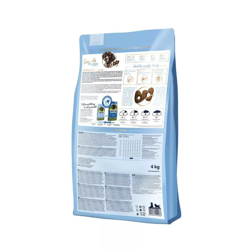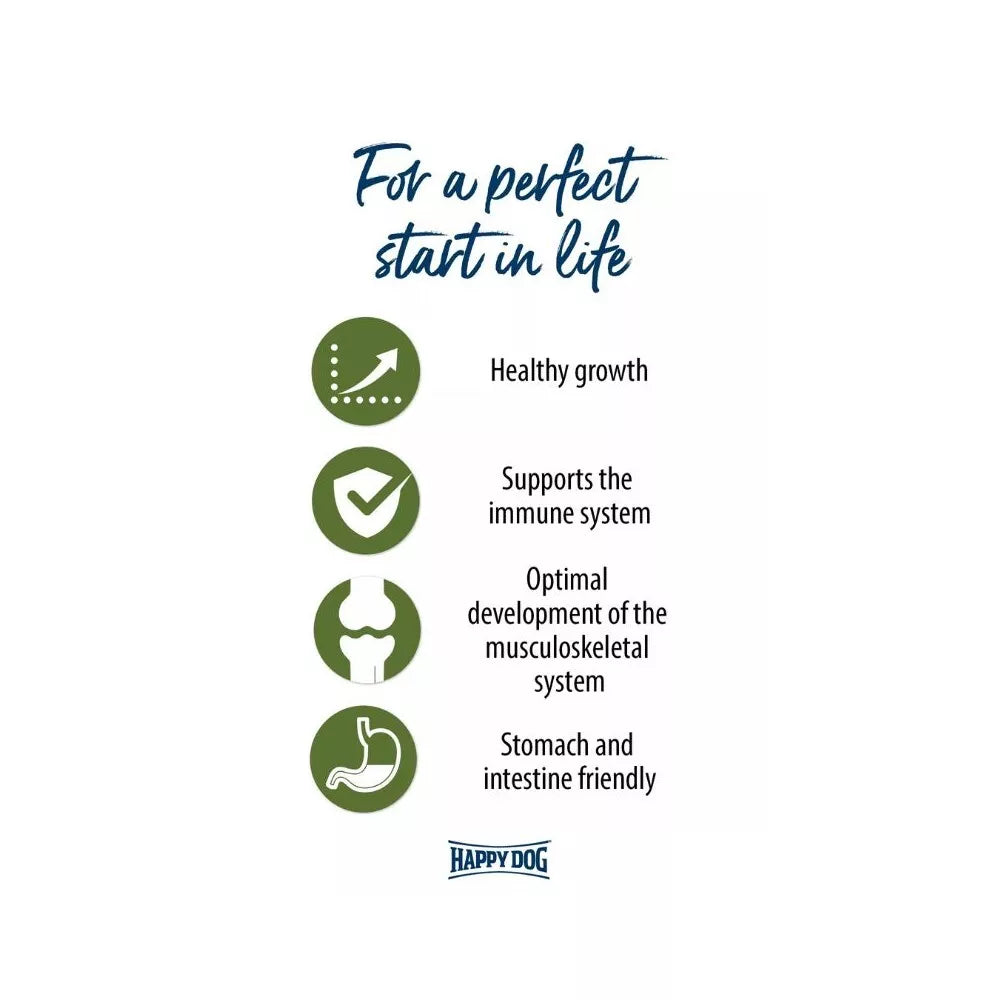Amžius: Pašaras idealiai tinka šuniukams nuo 4 savaičių iki 6 mėnesių. Vėliau, nuo 7 mėnesių, rekomenduojama pereiti prie "Happy Dog Sensible Junior Lamb & Rice".