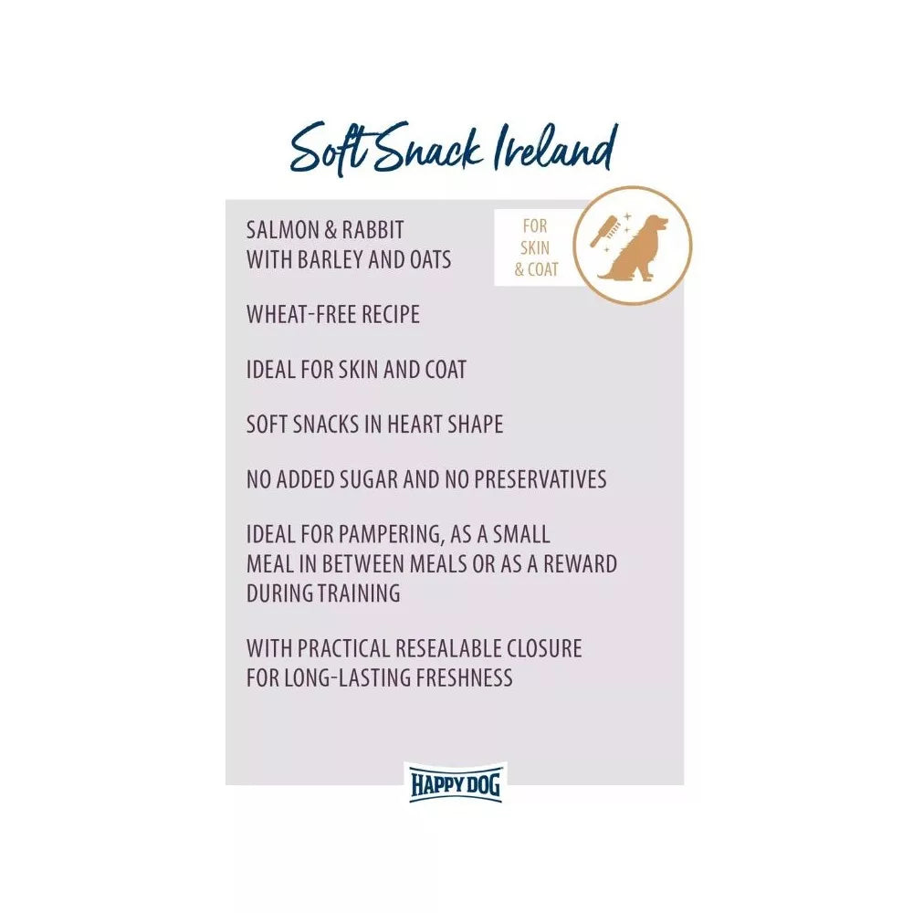 Ieškote tinkamų skanėstų šuniui? Išbandykite širdelės formos minkštus skanėstus "Soft Snack Ireland" - tai puikus skanėstas jūsų augintiniui. Švelni lašiša ir skanus triušis yra gardūs, o Omega-3 ir Omega-6 riebalų rūgštys padeda palaikyti blizgantį kailį. Receptą be kviečių gerai toleruoja jautrūs ir išrankūs vidutinių ir didelių veislių šunys. Šie užkandžiai pagaminti be pridėtinio cukraus ir be konservantų. Maišelis patogiai uždaromas, kad ilgiau išliktų šviežias. Garantuotas malonumas!