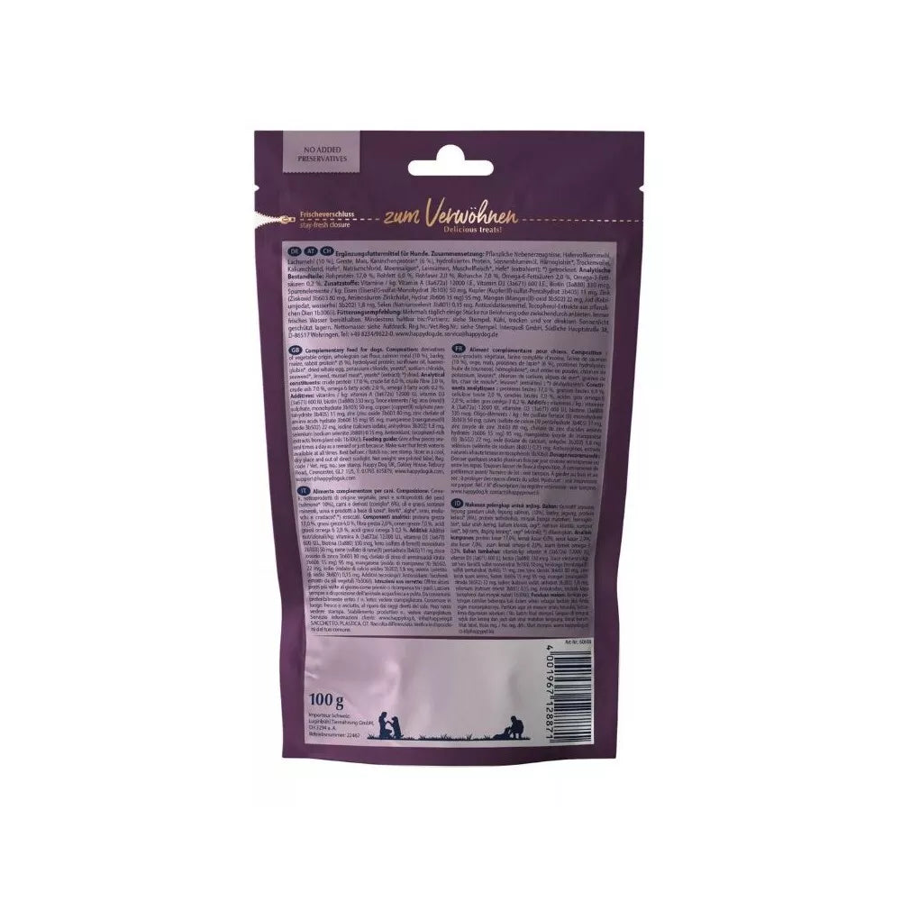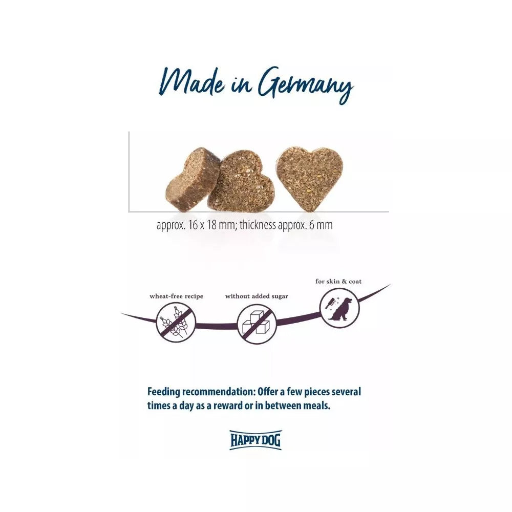 Sudėtis: augaliniai produktai, pilno grūdo avižų miltai, lašišų miltai (10%), miežiai, kukurūzai, triušienos baltymai (6%), hidrolizuoti baltymai, saulėgrąžų aliejus, hemoglobinas, kiaušinių milteliai, kalio chloridas, mielės, natrio chloridas, jūrų dumbliai, linų sėmenys, moliuskų mėsa, mielės (ekstraktas). Analitinės sudedamosios dalys: žali baltymai 17,0%, žali riebalai 6,0%, žalia ląsteliena 2,0%, žali pelenai 7,0%, drėgnis 14,0%, omega 6 riebalų rūgštys 2,0%, omega 3 riebalų rūgštys 0,2%. Priedai/1 kg: vitaminai: vitaminas A (3a672a) 12000 TV, vitaminas D3 (3a671) 600 TV, biotinas (3a880) 330 mcg. Mikroelementai: geležis (geležies II sulfatas, monohidratas 3b103) 50 mg, varis (vario II sulfatas pentahidratas 3b405) 11 mg, cinkas (cinko oksidas 3b603 80 mg, cinko chelatas iš amino rūgščių 3b606 15 mg) 95 mg, manganas (manganao II oksidas 3b502) 22 mg, jodas (kalcio jodatas, bevandenis 3b202) 1,8 mg, selenas (natrio selenitas 3b801) 0,15 mg. Antioksidantai, tokoferolio ekstraktas iš augalinių aliejų 1b306(i). Šėrimo rekomendacijos: duoti po keletą gabalėlių per dieną kai skanėstą kasdienio raciono paįvairinimui. Augintinis visuomet turi turėti šviežio vandens. Laikyti vėsioje, sausoje vietoje, saugoti nuo tiesioginių saulės spindulių. Geriausias iki/Partijos numeris/Gamintojas: žr. ant pakuotės.