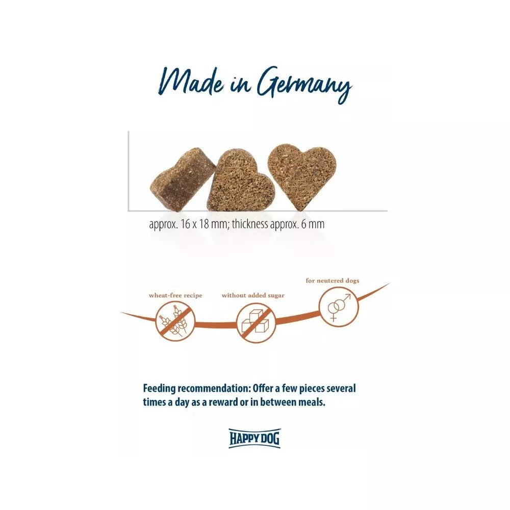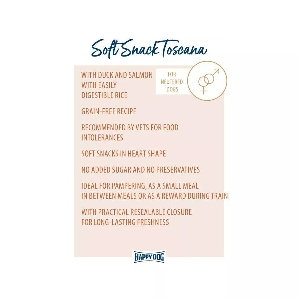 Minkšti širdelės formos skanėstai "Snack Toscana" puikiai tinka jūsų augintiniui palepinti. Lengvai virškinama antis ir puiki lašiša, pagardinta kvapniomis Viduržemio jūros regiono žolelėmis, yra tikras skonio potyris išrankiems augintiniams. Receptūra be kviečių ir su nedideliu riebalų kiekiu idealiai tinka vidutinių ir didelių veislių šunims, linkusiems į viršsvorį, kastruotiems šunims arba išrankiems šunims. Šie skanėstai pagaminti be pridėtinio cukraus ir be konservantų. Maišelis sandariai užsidaro, todėl užkandžiai ilgiau išlieka švieži.