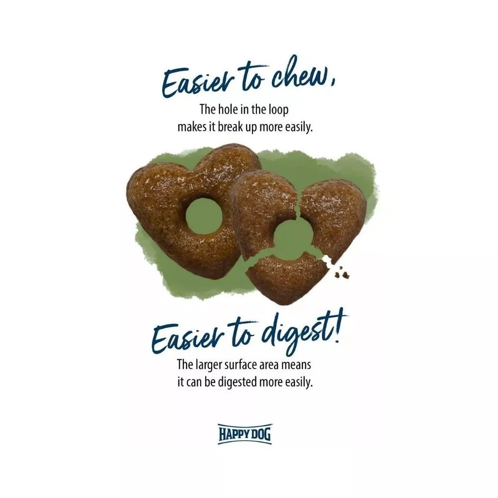 Visi HappyDog Young gaminiai gaminami širdelės formos, kurių viduryje yra skylutė. Tikslas – sukurti lengvai virškinamą šunų maistą. Dėl skylutės smulkūs gabalėliai greičiau suyra valgant – ir jūsų šuniui lengviau kramtyti. Didesnis paviršiaus plotas taip pat leidžia virškinimo sultims geriau apgaubti maistą skrandyje.