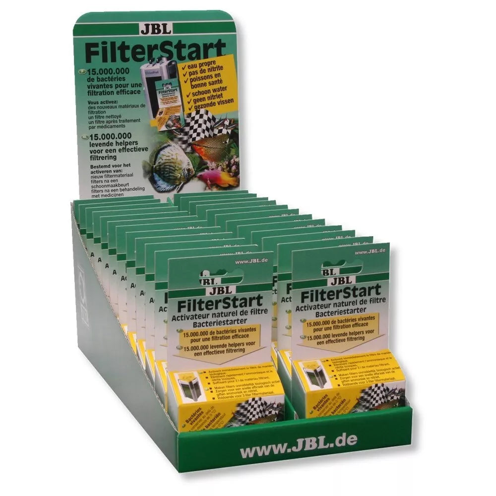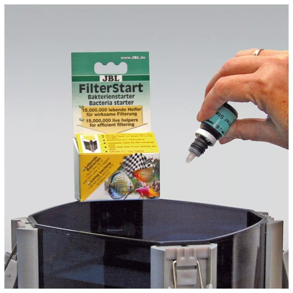 Patariama naudoti šį bakterijų koncentratą šiais atvejais: kai paleidžiate naują išorinį filtrą, po filtro išvalymo ar vandens atšviežinimo, po vaistų naudojimo, kad būtų greitai atstatytas gerųjų bakterijų kiekis akvariumo vandenyje. 15 000 000 gyvųjų bakterijų, padedančių efektyviau filtruoti vandenį. Šios bakterijos sumažina nuodingųjų nitritų ir amonio kiekius; bakterijų kiekio pakanka 3 litrams filtracinės medžiagos. Šios bakterijos naudojamos paleidžiant naują filtrą ar naujas filtracines medžiagas; išvalius filtrą; po medikamentinio gydymo. Naudojimas: sudrėkinkite filtracines medžiagas akvariumo vandenyje, gerai supurtykite buteliuką ir pilkite bakterijas ant filtracinių medžiagų. Įjunkite filtrą. Siekdami išsaugoti gerąsias bakterijas, prieš jų naudojimą į vandenį (bent prieš valandą) įpilkite JBL Biotopol ir tik tuomet naudokite JBL FilterStart. Nelaikyti aukštesnėje kaip 30˚C ar žemesnėje kaip 0˚C temperatūroje. Gamintojas/Grynasis kiekis/Partijos nr./Geriausias iki: žr. ant pakuotės. Prekių nuotraukos yra iliustracinio pobūdžio. Prekės aprašymas yra bendro pobūdžio ir ne visos savybės gali būti paminėtos. Ant produkto pakuotės nurodoma informacija yra detalesnė. Rekomenduojame vadovautis informacija esančia ant prekės pakuotės.