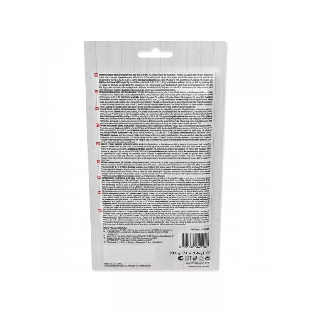 Ontario laižomi skanėstai supakuoti patogioje penkių 14 g tūbelių pakuotėje, kad pasta būtų šviežia ir paruošta patiekti. Katę galite šerti tiesiai iš tūbelės, ant laižymo kilimėlio, kitų interaktyvių žaislų arba naudoti sauso maisto skoniui pagerinti, jei katė jo atsisako.