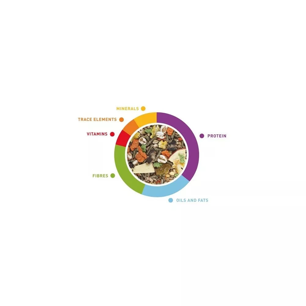 Sudėtis: augaliniai produktai (liucerna 11%), grūdai, daržovės 14,5% (morkos 1,5%), vaisiai 7% (saldžiavaisiai pupmedžiai 5%, obuoliai 0,5%), mineralai, augaliniai baltymų ekstraktai.