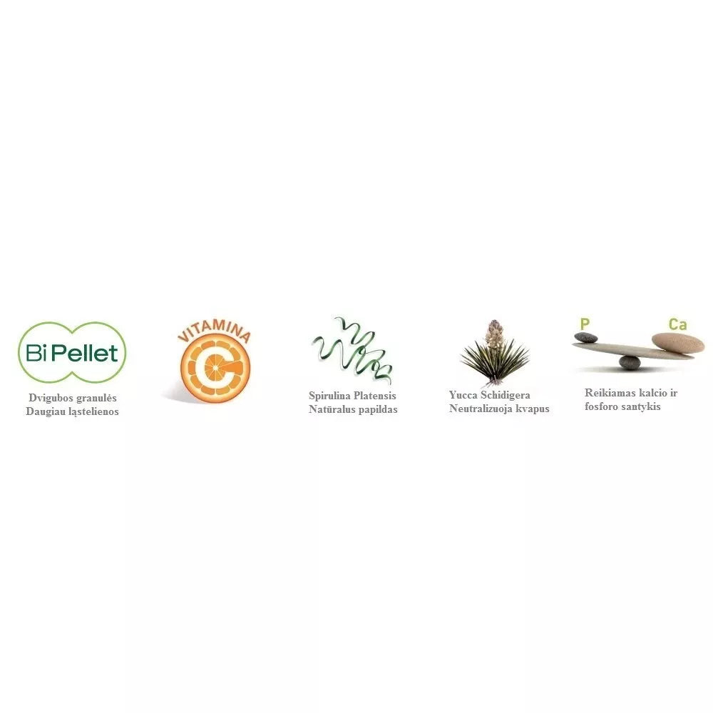 Sudėtis: augaliniai produktai, grūdai, sėklos, dumbliai (spirulina 1%), mineralai, juka (0,015%), fruktooligosacharidai.
