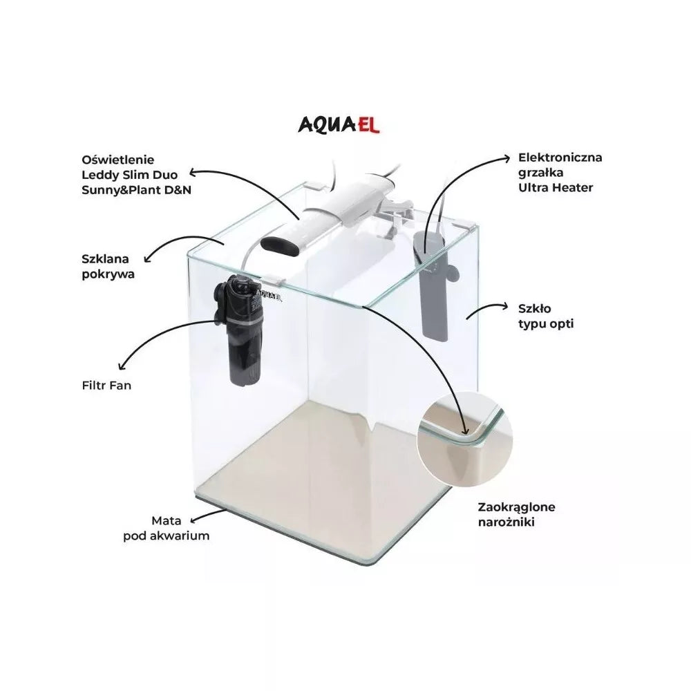 OptiBent Set yra pilnas (su įranga), dizainerių sukurtas akvariumo rinkinys. Jo užapvalinti kampai leidžia grožėtis povandeninio pasaulio grožiu iš kiekvienos perspektyvos, o opti stiklas yra itin skaidrus. Dėl to visuma sukuria unikalų vizualinį efektą, o jūs galite visiškai mėgautis savo akvariumo stebėjimu. Tinkamu akvariumo filtravimu, temperatūra ir apšvietimu pasirūpins komplekte esantys Aquael priedai. AQUARIUM SET OPTIBENT rinkinį sudaro: Akvariumas su dangteliu iš opti stiklo (kuris yra itin skaidrus) ir užapvalintais priekiniais kampais - be standartinių silikoninių sujungimų FAN filtras su reguliuojamu efektyvumu, aeracija ir vandens srauto nukreipėju Elektroninis šildytuvas Ultra Heater patvaraus plastiko korpuse su Smart Heating System, kuri savarankiškai parenka šildymo galią pagal aplinkos temperatūrą Visapusiškas apšvietimas Leddy Slim Duo Sunny & Plant D&N, kuris puikiai atkuria akvariumo vidaus spalvas dėl Sunny spektro ir palaiko greitą, nepertraukiamą augalų augimą dėl Plant spektro. Be to, lempa turi 3 apšvietimo režimus: DAY / DAYBREAK / NIGHT Apsauginis kilimėlis po akvariumu, atitinkantis jo formą Pasigrožėkite povandeniniu pasauliu su OptiBent rinkiniu! OptiBent Set 30 white Akvariumo talpa [L] 29 Galia [W] 10 Matmenys [cm] (ilgis x plotis x aukštis) 29x29x35 Apšvietimas LEDDY SLIM DUO SUNNY PLANT & NIGHT Filtras Fan Mini - Plus Šildytuvas Ultra Heater 25 Stiklo storis [MM] 4 Stiklo tipas Opti Savybės: Partijos nr.: žr. ant pakuotės.CE sertifikatas2 metų garantija Gamintojas: Aquael PRISTATYMAS: Nemokamai atsiimkite Kaune arba Vilniuje (Akvazoo parduotuvėse) Pristatymas į namus (be užsakomųjų krovos darbų) - 4,90€ Pristatymo mokestis bus priskaičiuotas automatiškai, įsidėjus prekę (akvariumą ar kitas didelių gabaritų prekes) į krepšelį. Prekių nuotraukos yra iliustracinio pobūdžio. Prekės aprašymas yra bendro pobūdžio ir ne visos savybės gali būti paminėtos. Ant produkto pakuotės nurodoma informacija yra detalesnė. Rekomenduojame vadovautis informacija esančia ant prekės pakuotės.