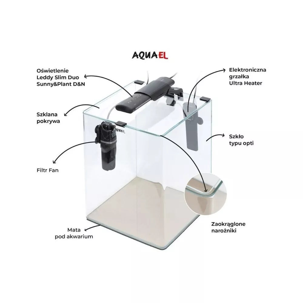 OptiBent Set yra pilnas (su įranga), dizainerių sukurtas akvariumo rinkinys. Jo užapvalinti kampai leidžia grožėtis povandeninio pasaulio grožiu iš kiekvienos perspektyvos, o opti stiklas yra itin skaidrus. Dėl to visuma sukuria unikalų vizualinį efektą, o jūs galite visiškai mėgautis savo akvariumo stebėjimu. Tinkamu akvariumo filtravimu, temperatūra ir apšvietimu pasirūpins komplekte esantys Aquael priedai. AQUARIUM SET OPTIBENT rinkinį sudaro: Akvariumas su dangteliu iš opti stiklo (kuris yra itin skaidrus) ir užapvalintais priekiniais kampais - be standartinių silikoninių sujungimų FAN filtras su reguliuojamu efektyvumu, aeracija ir vandens srauto nukreipėju Elektroninis šildytuvas Ultra Heater patvaraus plastiko korpuse su Smart Heating System, kuri savarankiškai parenka šildymo galią pagal aplinkos temperatūrą Visapusiškas apšvietimas Leddy Slim Duo Sunny & Plant D&N, kuris puikiai atkuria akvariumo vidaus spalvas dėl Sunny spektro ir palaiko greitą, nepertraukiamą augalų augimą dėl Plant spektro. Be to, lempa turi 3 apšvietimo režimus: DAY / DAYBREAK / NIGHT Apsauginis kilimėlis po akvariumu, atitinkantis jo formą Pasigrožėkite povandeniniu pasauliu su OptiBent rinkiniu! OptiBent Set 30 black Akvariumo talpa [L] 29 Galia [W] 10 Matmenys [cm] (ilgis x plotis x aukštis) 29x29x35 Apšvietimas LEDDY SLIM DUO SUNNY PLANT & NIGHT Filtras Fan Mini - Plus Šildytuvas Ultra Heater 25 Stiklo storis [MM] 4 Stiklo tipas Opti Savybės: Partijos nr.: žr. ant pakuotės.CE sertifikatas2 metų garantija Gamintojas: Aquael PRISTATYMAS: Nemokamai atsiimkite Kaune arba Vilniuje (Akvazoo parduotuvėse) Pristatymas į namus (be užsakomųjų krovos darbų) - 4,90€ Pristatymo mokestis bus priskaičiuotas automatiškai, įsidėjus prekę (akvariumą ar kitas didelių gabaritų prekes) į krepšelį. Prekių nuotraukos yra iliustracinio pobūdžio. Prekės aprašymas yra bendro pobūdžio ir ne visos savybės gali būti paminėtos. Ant produkto pakuotės nurodoma informacija yra detalesnė. Rekomenduojame vadovautis informacija esančia ant prekės pakuotės.