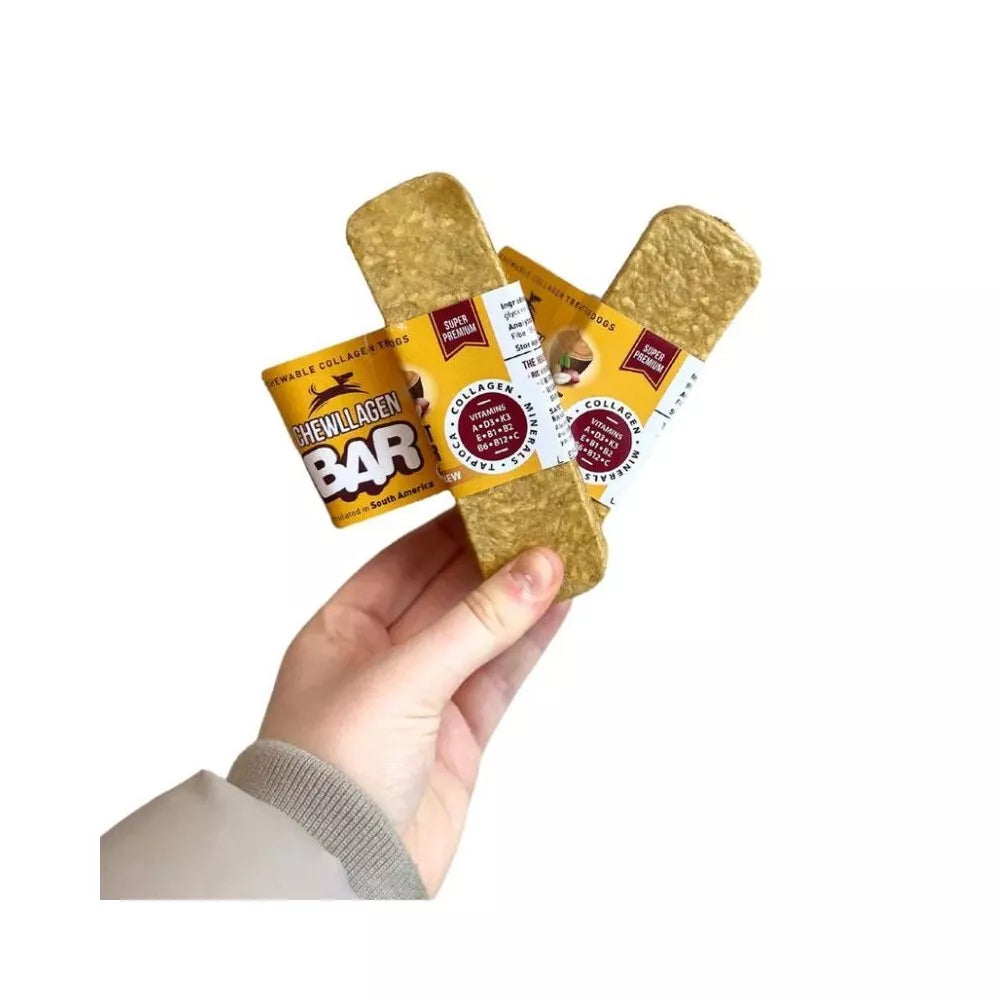 CHEWLLAGEN BAR yra kietas skanėstas, skirtas sąnarių sveikatai palaikyti, judrumui skatinti ir bendrai savijautai gerinti, nes suteikia aukštos kokybės kolageno, kuris yra būtinas jungiamojo audinio, pavyzdžiui, sąnarių, odos ir sausgyslių, būklei palaikyti. Skanėsto sudėtyje taip pat yra hidrolizuoto kolageno, vitaminų, mineralų ir glikemiją kontroliuojančios tapijokos. Savybės: Kolagenas - sudėtyje yra jautienos kolageno, kuris yra natūralus kolageno šaltinis, prisidedantis prie sąnarių sveikatos, odos atsparumo ir elastingumo. Glikemijos kontrolė - dėl lėtai įsisavinamų skaidulų tapijoka gali padėti kontroliuoti glikemiją. Taip ji padeda atitolinti cukraus įsisavinimą, padėdama subalansuoti gliukozės kiekį kraujyje. Energijos padidėjimas - dėl gerųjų angliavandenių padidėja energijos kiekis ir pailgėja energijos trukmė visai dienai. Natūralus vitamino C šaltinis - sudėtyje yra tapijokų, kurios yra natūralus vitamino C šaltinis. Vitaminas C padeda skatinti natūralią kolageno gamybą organizme. Antioksidacinis poveikis – kartu su vitaminu C, sudėtyje gausu resveratrolio - galingo antioksidanto. Jo funkcija - veikti prieš laisvuosius radikalus ir lėtinti ląstelių senėjimą. Su vitaminais ir mineralais - sudėtyje yra visų būtiniausių vitaminų ir mineralų, kurie reikalingi optimaliam organizmo funkcionavimui. Pašaro papildas šunims. Sudėtis: tapijoka, kolagenas, augalinis glicerinas, vitaminai (A, E, K3, B1, B2, B6, B12, C, D3. Analitinės sudedamosios dalys: žali baltymai 60%, drėgnis 15%, mineralai 8%, žalia ląsteliena 5%, angliavandeniai 10%. Priedai: jusliniai priedai: natūralūs dažikliai; technologiniai priedai: konservantai. Netinka šuniukams iki 4 mėn. amžiaus. Nepalikite šuns su šiuo kramtalu be priežiūros. Šuns indelyje visada turi būti švaraus geriamo vandens. Laikyti sausai ir vėsiai. Partijos numeris ir geriausias iki: žr. ant pakuotės. Prekių nuotraukos yra iliustracinio pobūdžio. Prekės aprašymas yra bendro pobūdžio ir ne visos savybės gali būti paminėtos. Ant produkto pakuotės nurodoma informacija yra detalesnė. Rekomenduojame vadovautis informacija esančia ant prekės pakuotės.