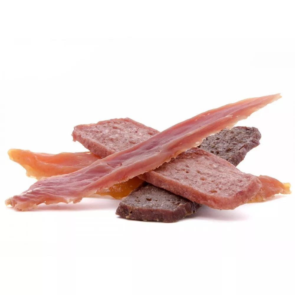 Sudėtis: džiovinta vištiena, antiena, eriena , triušiena. Svoris: 80g Aukštos kokybės džiovintos file juostelės papildo mitybą reikiamais mineralais. Gali būti naudojama kaip paskatinimo priemonė. Skanėstai supakuoti patogiame naudoti, sandariame maišelyje, kurį galima atidaryti ir vėl uždaryti, todėl šviežumas išlieka ilgai. Laikyti sausoje vėsioje vietoje. Netinkamas vartoti žmonėms. Viduje yra maišelis su deoksidatoriumi, jo šuniui duoti negalima. Gyvūnui visuomet turi būti pasiekiamas šviežias vanduo. Prekių nuotraukos yra iliustracinio pobūdžio. Prekės aprašymas yra bendro pobūdžio ir ne visos savybės gali būti paminėtos. Ant produkto pakuotės nurodoma informacija yra detalesnė. Rekomenduojame vadovautis informacija esančia ant prekės pakuotės.