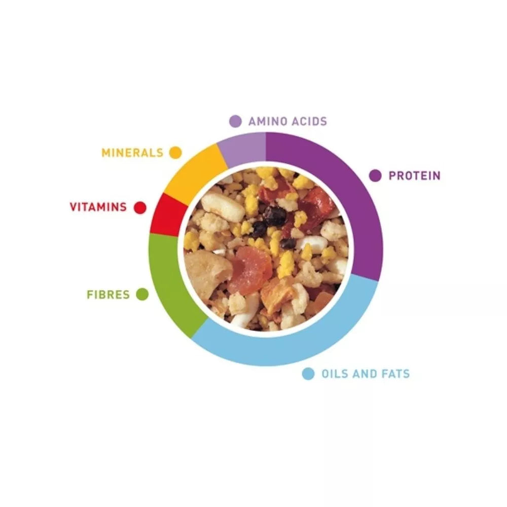 Sudėtis: kepinukai, įvairūs cukrūs, vaisiai (ananasai 2%, bananai 2%, vynuogės 1%), aliejai ir riebalai, augaliniai baltymų ekstraktai, sėklos, sorbitolis, grūdai, daržovės (raudonasis čili 0,5%), kiaušiniai ir jų perdirbimo produktai (kiaušiniai 2%), mineralai (smulkintos kriauklės 2%).